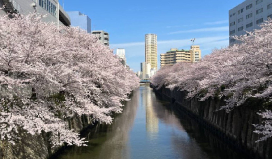 目黒川の桜並木を混雑をさけて貸切船でゆっくりとお花見遊覧。 〈目黒川は約4キロメートルに渡り約800本の桜並木が続く、都内有数のお花見の名所です〉